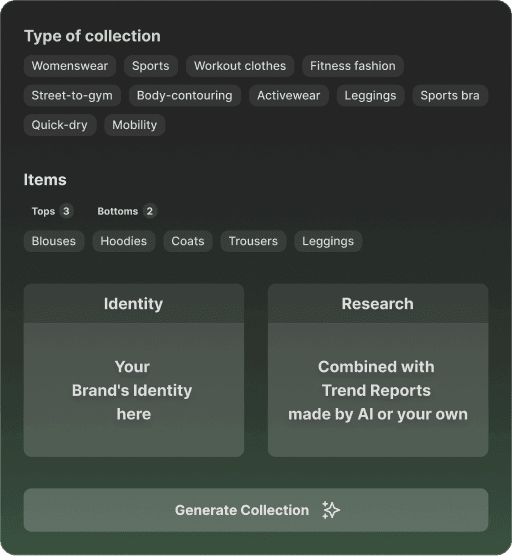 Our extended plan speeds up your workflow — build your brand identity, get custom trend reports, and create full collections in just a few clicks, no endless prompts.